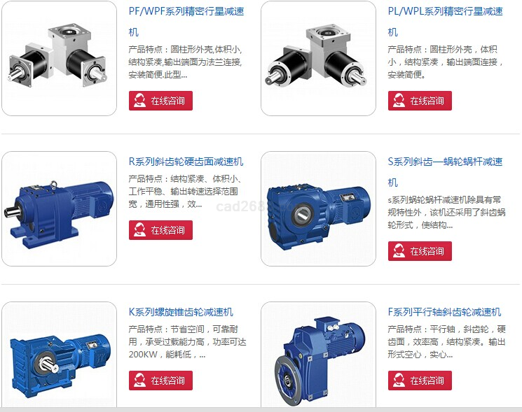 公司主要产品有:P系列精密行星减速机,R系列斜齿轮硬齿面减速机,S系列斜齿轮-蜗轮减速机,K系列斜齿轮-螺旋锥齿轮减速机,F系列平行轴斜齿轮减速机,T系列螺旋锥齿轮换向器,G系列全封闭齿轮减速机,RV系列铝合金蜗轮蜗杆减速机,BX系列摆线针轮减速机,MB系列转臂行星无级变速机,WP系列铸铁蜗轮减速机,SWL系列蜗轮丝杆升降机,ZDY、ZLY、ZSY系列硬齿面圆柱齿轮减速机等系列,有10000多种传动比.产品广泛用于石油、化工、轻工、食品、建材、冶金、矿山、纺织、起重、建筑、运输、能源等机械设备领域。