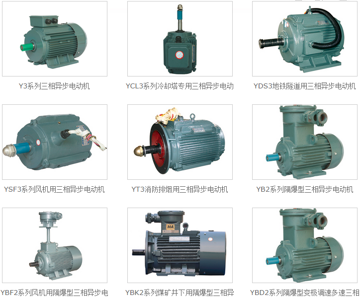 公司主要生产Y3系列低压大功率(机座号63-500)三相异步电动机;YX3系列高效节能电机(2级能效);YB2、YBK2、YBF2系列(机座号63-630)隔爆型电机;YKK、YKS系列(机座号355-630)高压电机;YTH3系列隧道风机专用电机; YD3、YDT3系列双速电机;YVP3系列变频电机,Y3SF、Y3HTF系列风机电机, YBWL隔爆型外转子电机、YDW系列立式、卧式外转子电机,YZ、YZR起重冶金专用电机,YCL冷却塔专用电机 ,F-31、F-61、F-81冷却塔专用减速机等。专业生产全系列隧道风机电机、离心风机电机、混流风机电机、诱导风机电机、屋顶风机电机、消防高温排烟风机专用电机、轴流风机专用电机等。还可为用户设计与制造特殊要求的专用电机、非标电机、异电压和异频率电机。