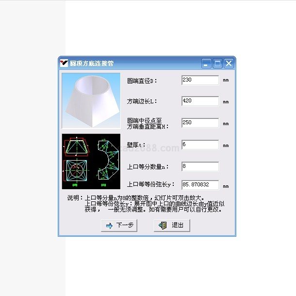 三节平行口异径圆柱圆锥弯管等大量的钣金件设计、计算、图形展开和绘制功能。