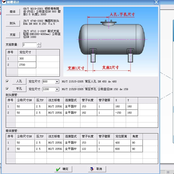 储罐设计系统基于三维CADSW平台开发,提供专业的可视化交互界面用于选择和输入组成储罐的零部件数据,例如当选择了筒体的尺寸之后,在选择封头和支座时,系统会自动找到与筒体直径相同的封头和支座;当选择了封头或筒体上的出管后,在选择法兰时,系统会自动找到与出管直径相同的法兰。当所有的零部件选择完毕后,系统自动高效、准确生成储罐的装配图形、工程图、序号、明细表和重量统计。