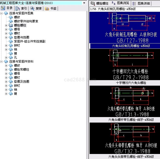 《机械工程图库大全》联接与紧固卷包括螺纹、螺纹零件结构要素、螺孔和沉孔、螺栓、螺柱、螺钉、木螺钉、自攻螺钉、螺母、垫圈、挡圈、铆钉、销、键、紧固件—组合件等联接紧固件的种类、规格、特点、技术要求、应用及图形库。