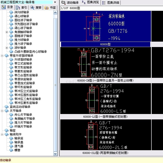 《机械工程图库大全》轴承卷内容包括轴承的资料及轴承图集汇编。涉及的轴承有:深沟球轴承,调心球轴承,圆柱滚子轴承,双列圆柱滚子轴承,调心滚子轴承,角接触球轴承,三点和四点接触球轴承,双列角接触球轴承,圆锥滚子轴承,推力球轴承,推力滚子轴承,轻中系列滚针轴承,滚轮滚针轴承,凸缘外圈微型向心球轴承,球面球轴承,带冲压立式座轴承,带冲压菱形座轴承,带冲压三角形座轴承,带冲压圆形座轴承,带方形座轴承,带滑块座轴承,带环形座轴承,带立式座轴承,带菱形座轴承,带凸台圆形座轴承,轴承附件等。