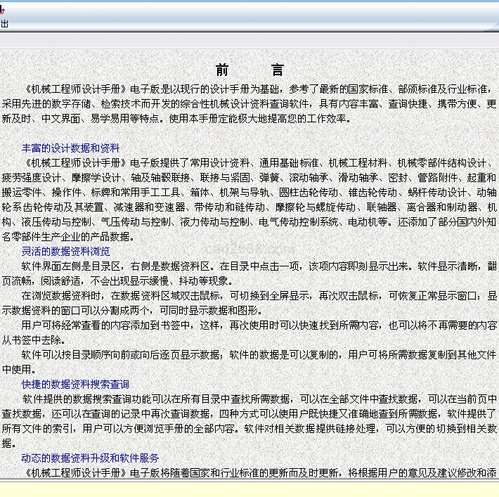软件界面左侧是目录区,右侧是数据资料区。在目录中点击一项,该项内容即刻显示出来。软件显示清晰,翻页流畅,阅读舒适,不会出现显示缓慢、抖动等现象。