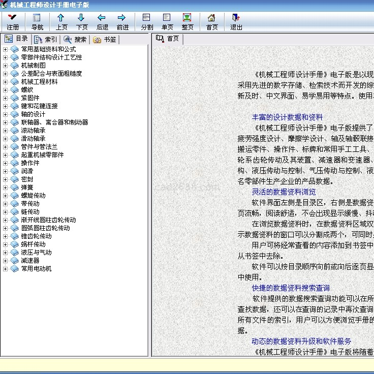 《机械工程师设计手册》电子版提供了常用基础资料和公式、零部件结构设计工艺性、机械制图、公差配合与表面粗糙度、机械工程材料、螺纹、紧固件、键和花键连接、轴的设计、联轴器、离合器、制动器、滚动轴承、滑动轴承、管件与管法兰、起重机械零部件、操作件、润滑、密封、弹簧、螺旋传动、带传动、链传动、渐开线圆柱齿轮传动、圆弧圆柱齿轮传动、锥齿轮传动、蜗杆传动、液压与气动、减速器、常用电动机等。还添加了部分国内外知名零部件生产企业的产品数据。