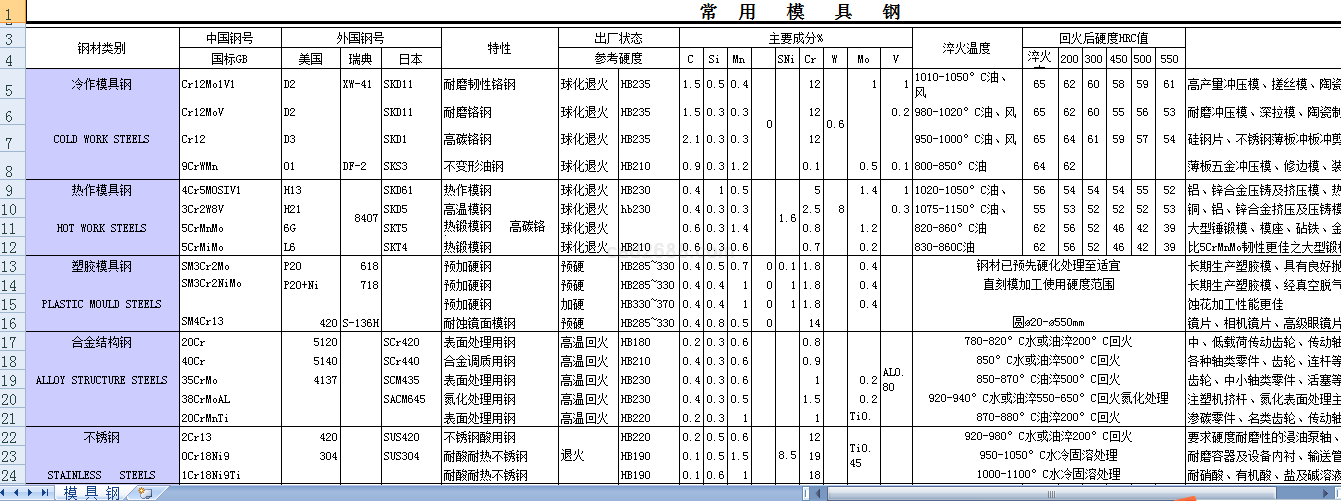 模具钢对照表内容如下: