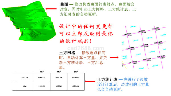 在以往的设计过程中,当设计完成、各种表格都生成后,发现某些数据(如自然标高或设计标高)需要调整,通常的做法是把自然标高和设计标高修改后,再把相关联的部分重新做一遍(如重新计算土方量),表格也要删掉重新生成,较为繁琐,是一件令设计人员很为头疼的事情。土方计算的动态更新机制则简化了这一过程,使设计后的修改变为一件极为轻松的事情。