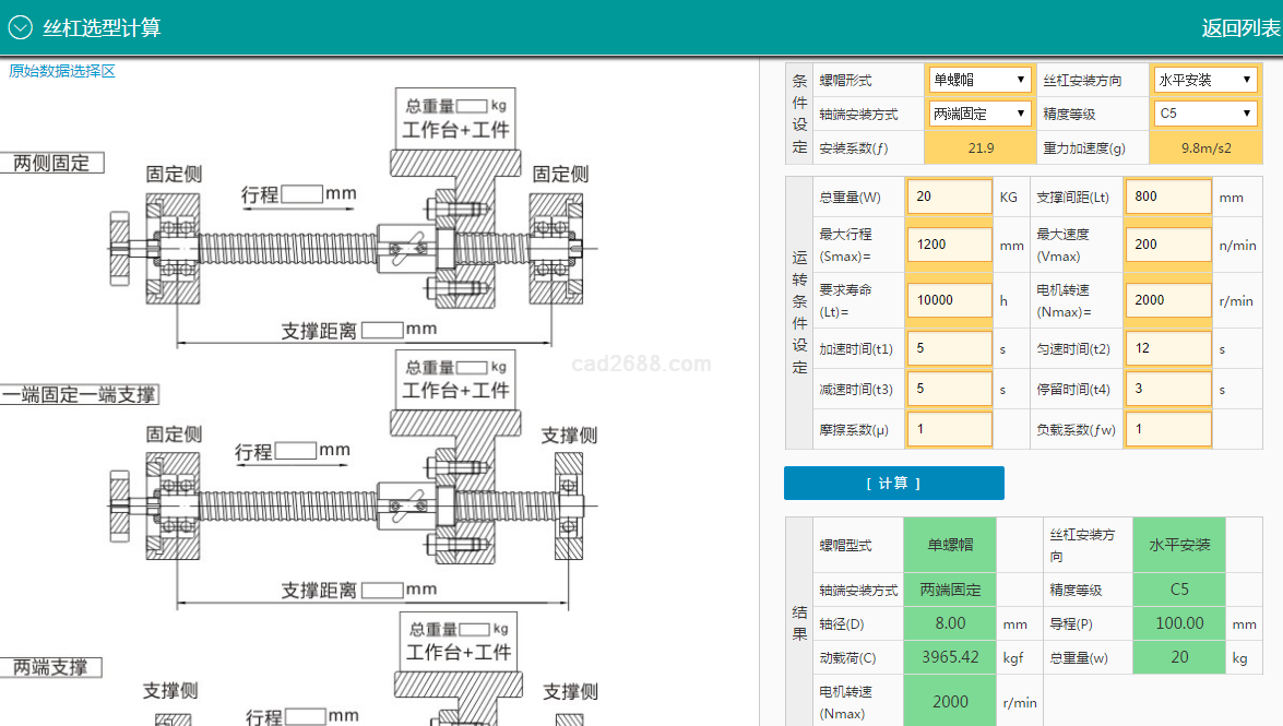 怡合达丝杠选型计算为在线运行,您可以直接在下面的参数中输入数据,之后点击计算,完成计算过程,具体参数输入如下: