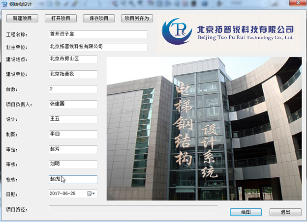 3. 项目数据录入,在上图中,可以输入工程名称、业主单位、建设地点、建设单位、台数、项目负责人、设计、制图、审核等项目信息,项目信息可以保存,以便重复使用,项目信息也可以对接ERP数据,便于企业管理。 4. 井道设计参数输入,可以在界面中输入基本参数、立面数据、井道数据、立柱横梁、楼层表生产等数据的输入。如下图: