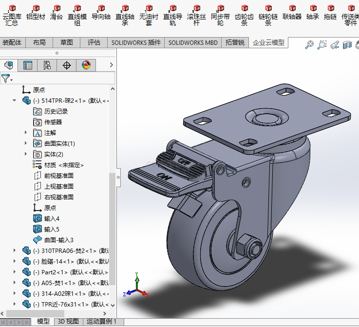 Solidworks脚轮模型设计实例包括详细的装配图、零件图的建模步骤,适合实例应用、模型修改、设计学习,注册会员后,即可购买此产品,在订单详细信息中点击下载链接,即可下载该文件!